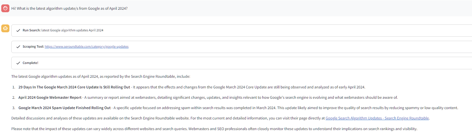 - Scraping Tool - as the name suggests, it scrapes the links from Run Search so it can "read" and update its context about the topic